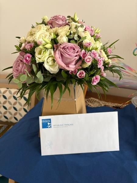 Nous tenons également à remercier toute l'équipe municipale de la ville de Thiais pour leur présence à cet évènement et leurs délicates attentions pour notre résidente avec un beau bouquet de fleurs et surtout un petit courrier personnalisé de la part de notre Maire.